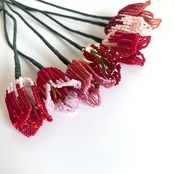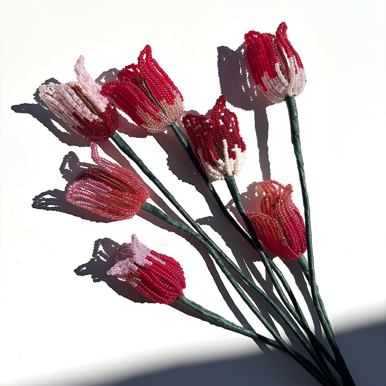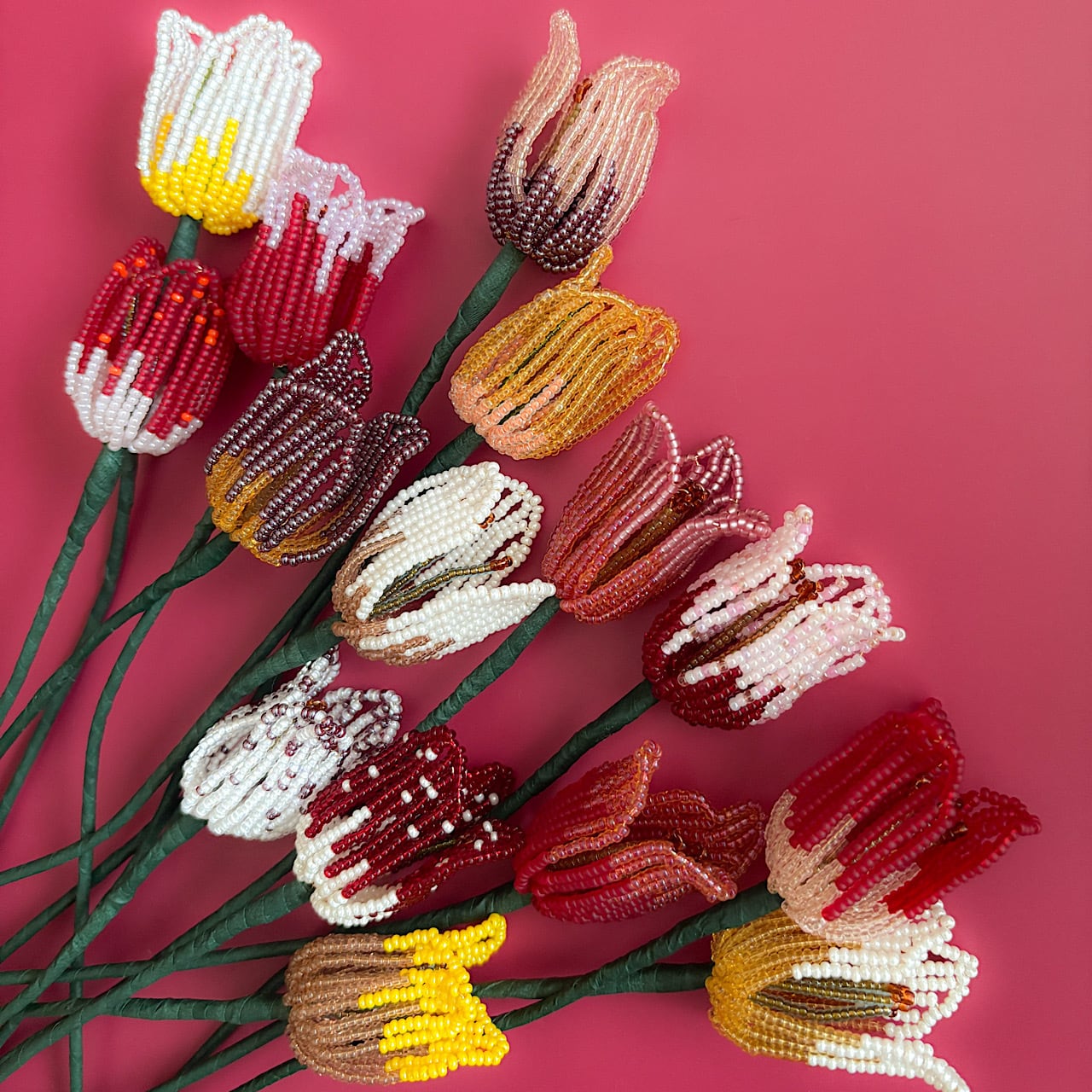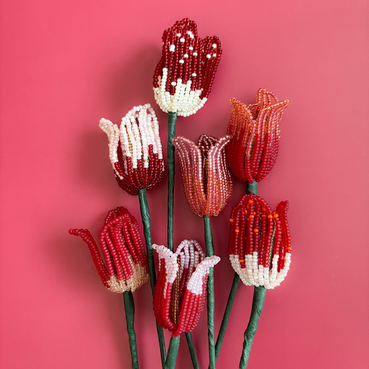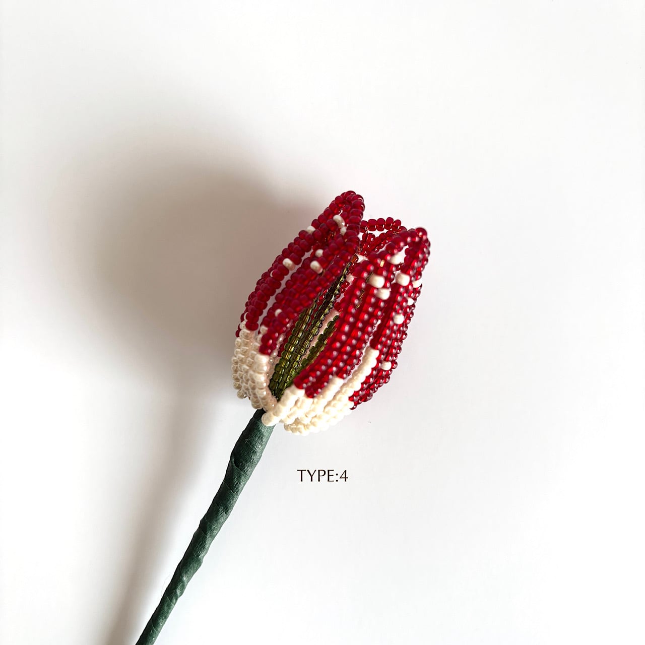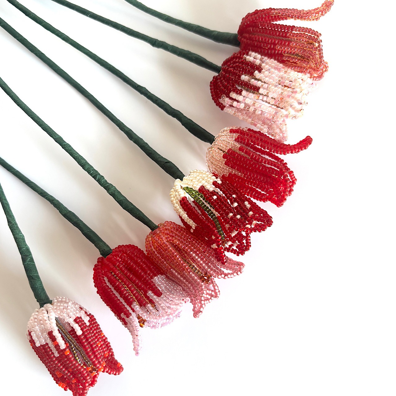 ころんとしたフォルムと、やわらかな色の重なりをビーズで一つひとつ丁寧に表現しました。