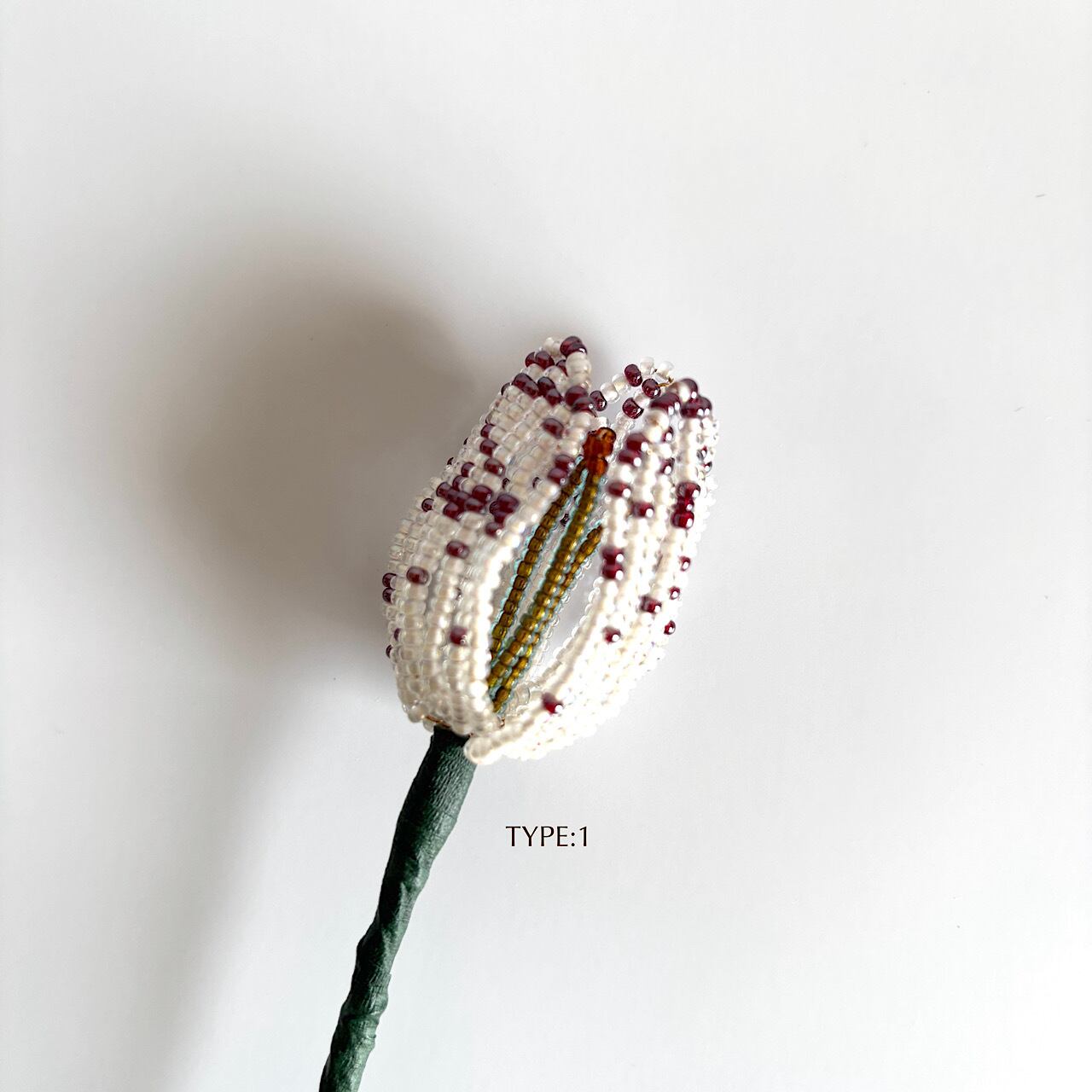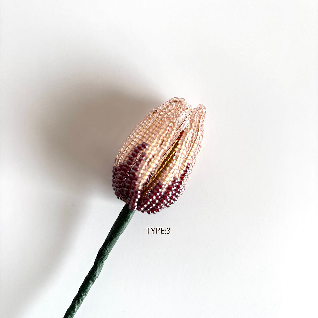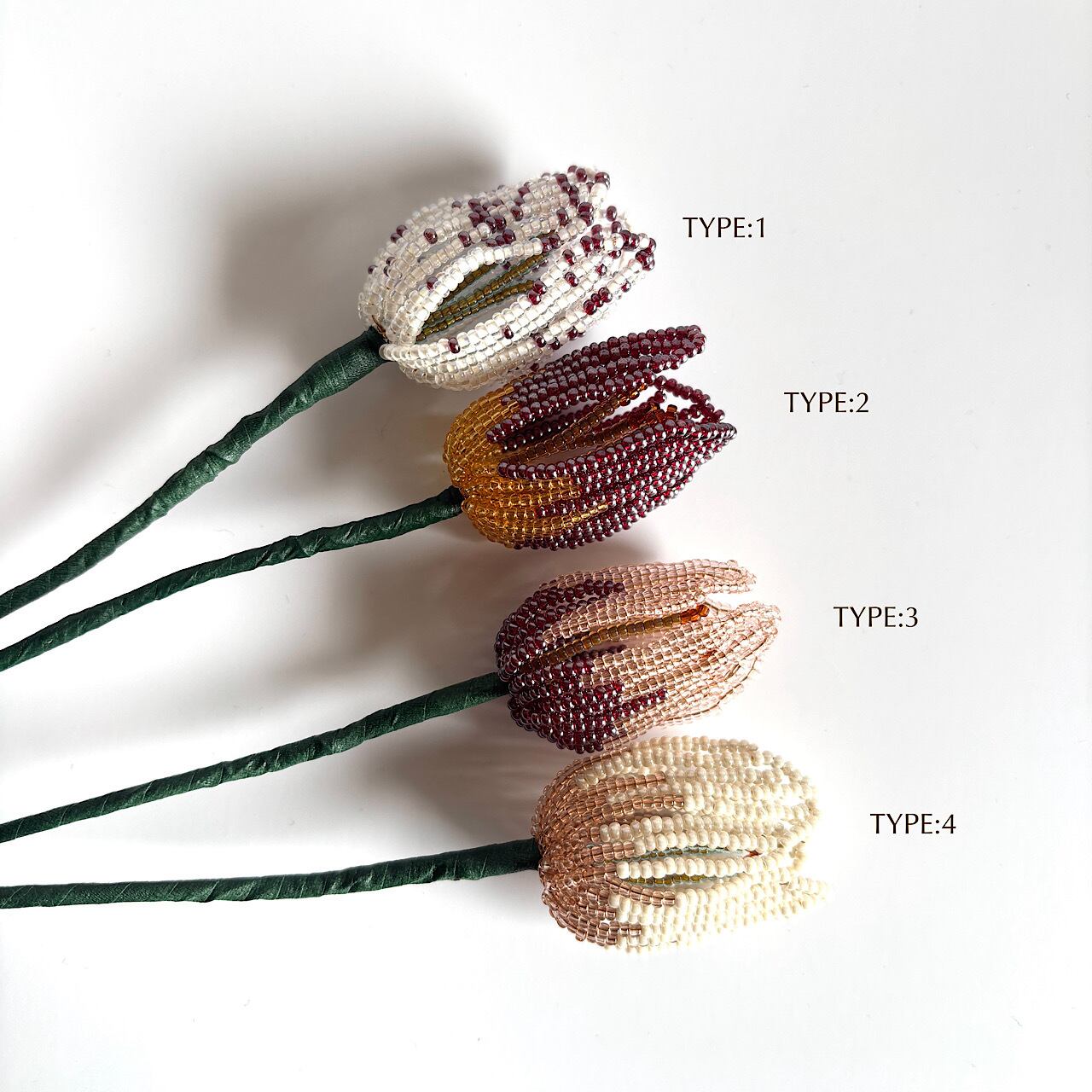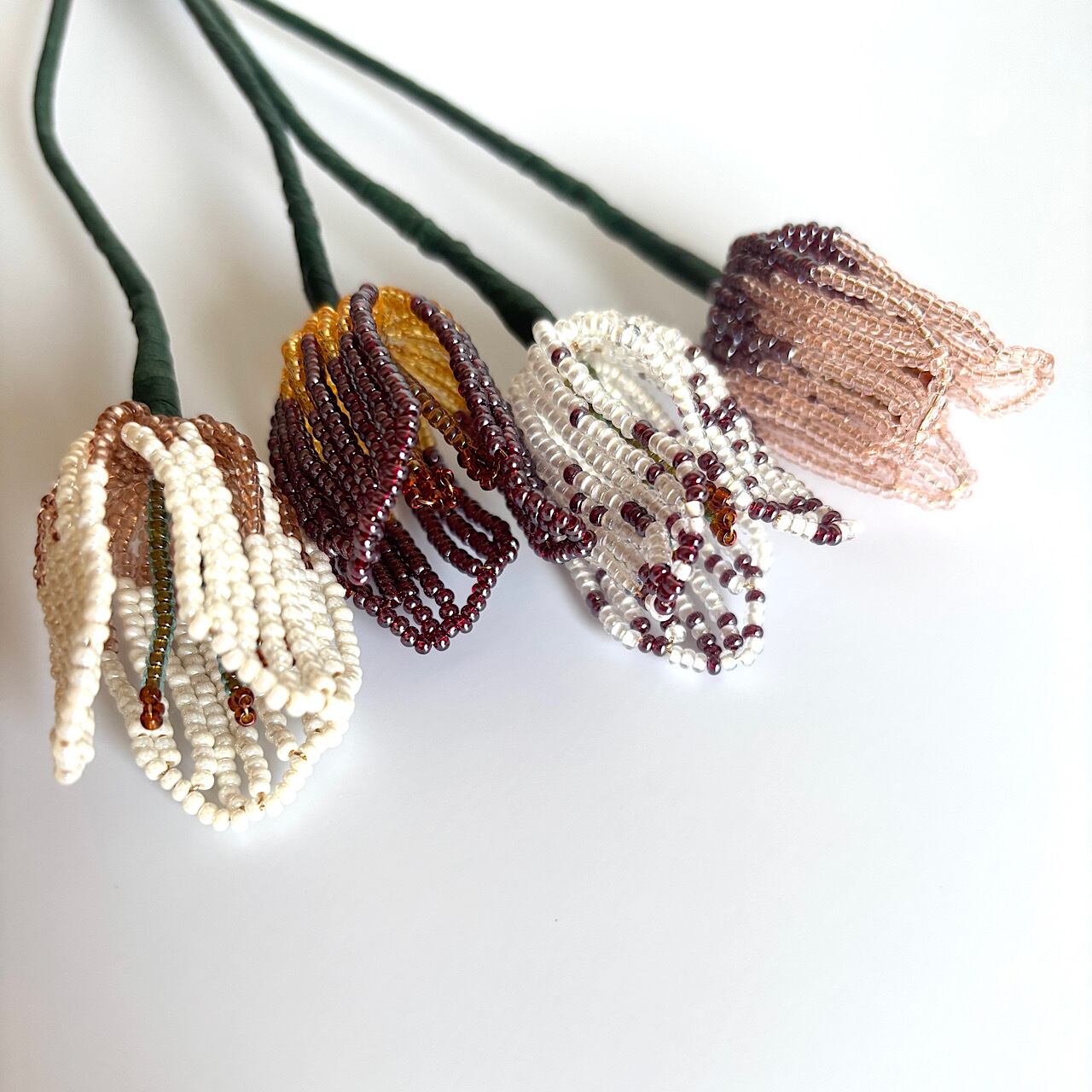 ころんとしたフォルムと、やわらかな色の重なりをビーズで一つひとつ丁寧に表現しました。