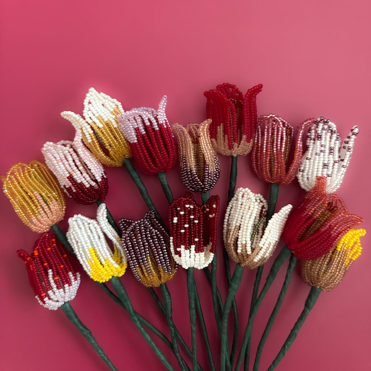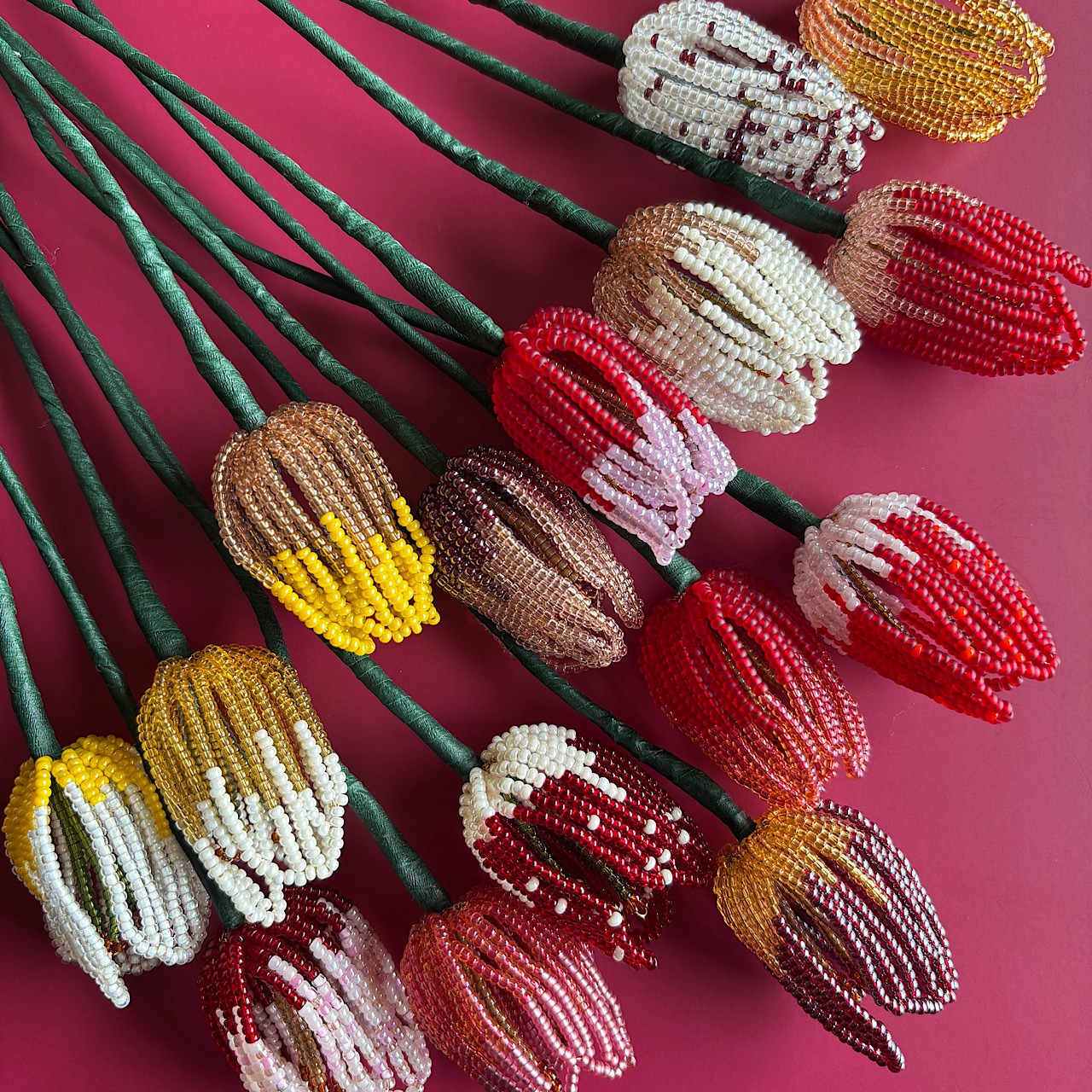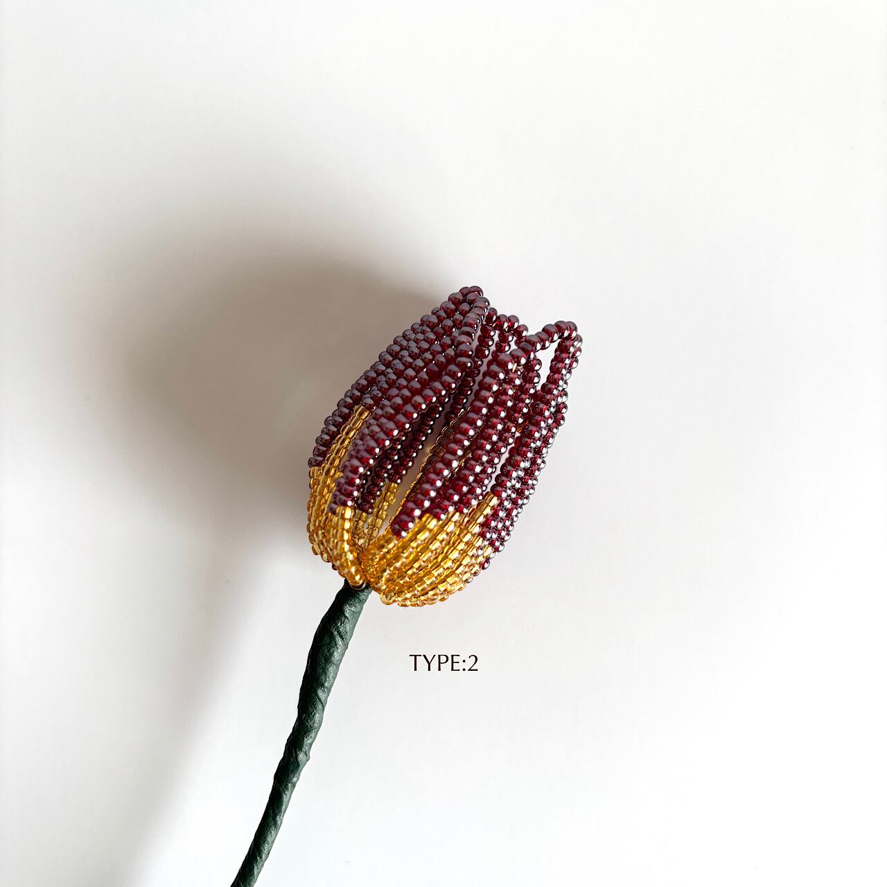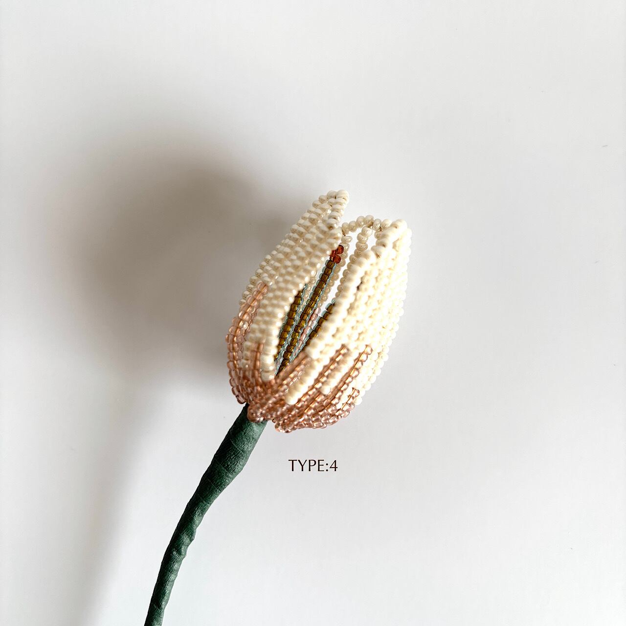 ころんとしたフォルムと、やわらかな色の重なりをビーズで一つひとつ丁寧に表現しました。